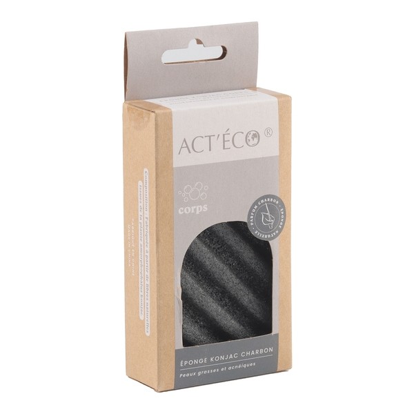 Act Eco éponge konjac charbon est une éponge biodégradable idéale pour les peaux grasses et acnéiques. Elle est issue de fibres naturelles provenant de la plante Amorphophalus konjac.