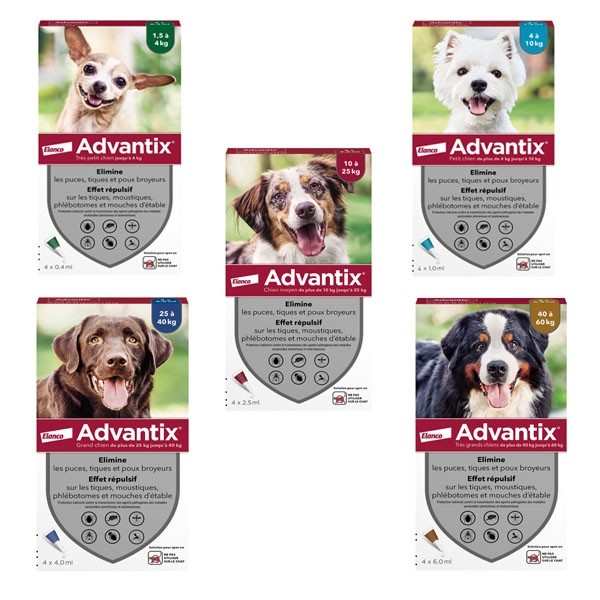 Advantix pour chien tue les puces, les tiques et les poux broyeurs en agissant sur leur système nerveux. Il permet ainsi de traiter les chiens déjà infestés. Advantix chien assure aussi une action répulsive contre les tiques, moustiques, phlébotomes et mouches d'étable.