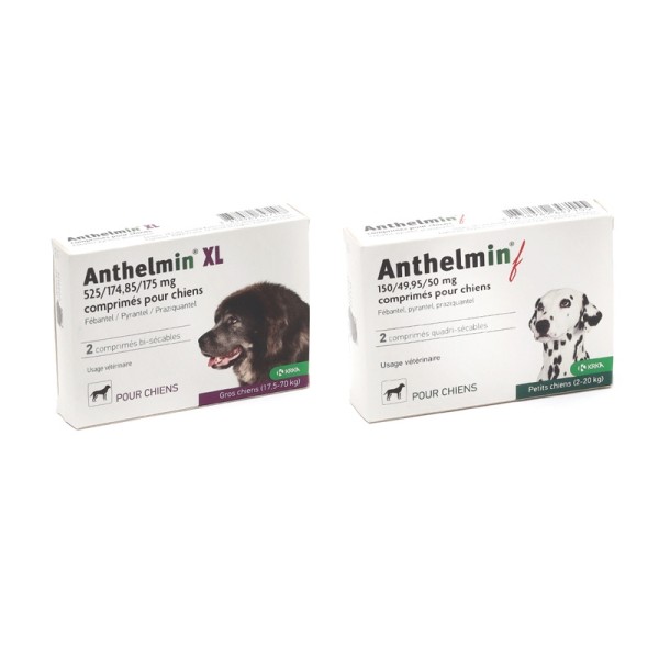 Anthelmin F convient pour les petits chiens (2-20 kg) et Anthelmin XL pour les gros chiens (17,5-70 kg).