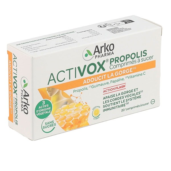 Activox Propolis comprimés est un complément alimentaire avec édulcorant à base de Guimauve, de Propolis, de Vitamine C et de Papaïne.