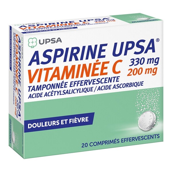 Aspirine Vitaminée C est un médicament des laboratoires UPSA qui se présente sous forme de comprimés effervescents. Il est destiné aux adultes et aux enfants pesant plus de 20 kg, dans le cadre du traitement des douleurs et de la fièvre.