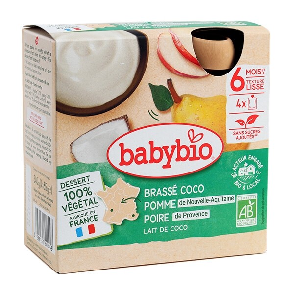 Aliment pour bébés à base d'un mélange de fruits, de lait de coco et de riz bio.