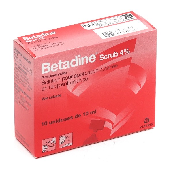 Bétadine scrub 4% en solution est un médicament antiseptique et désinfectant contenant de l'iode. Il se présente en solution moussante, sous forme d'unidoses, et son utilisation nécessite un rinçage soigné. Il est utilisé localement pour traiter et nettoyer les affections de la peau et des muqueuses infectées ou risquant de s'infecter. Il est également utilisé pour le lavage antiseptique des mains du personnel soignant et des mains du chirurgien, ainsi que pour le lavage antiseptique pré-opératoire.