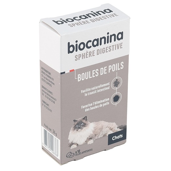 Lorsque votre chat fait sa toilette en se léchant le corps, il arrive qu'il avale des poils. Cela survient en particulier lors des mues saisonnières. Ces poils ne seront pas digérés et vont se retrouver dans l'intestin ou l'estomac de l'animal. La présence de ces boules de poils, aussi appelées trichobézoards, peut parfois s'avérer problématique, occasionnant des vomissements ou une constipation. Biocanina chat boules de poils est justement étudié pour agir sur le transit de façon à favoriser l'élimination des trichobézoards.