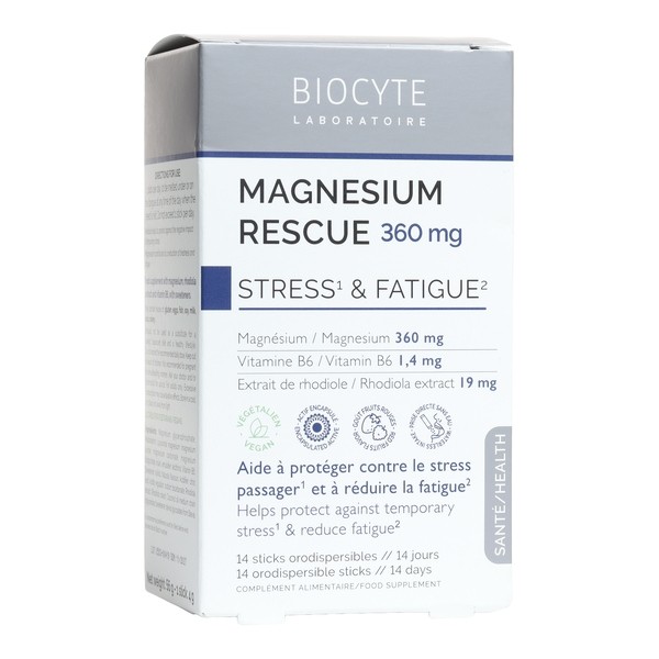 Magnesium Rescue de Biocyte est un complément alimentaire à base de magnésium (360 mg), d'extrait de rhodiole (19 mg) et de vitamine B6 (1,4 mg), avec édulcorants.
