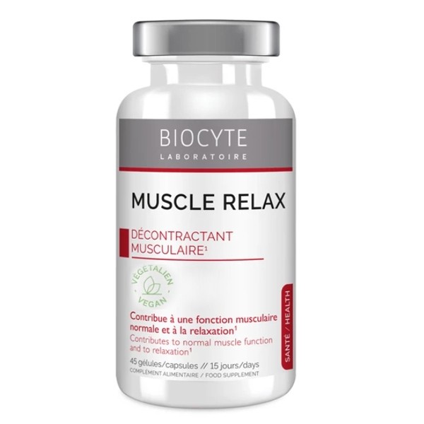 Biocyte Muscle Relax est un complément alimentaire à base d'extraits de plantes, de vitamines, minéraux et de palmitoylethanolamide.