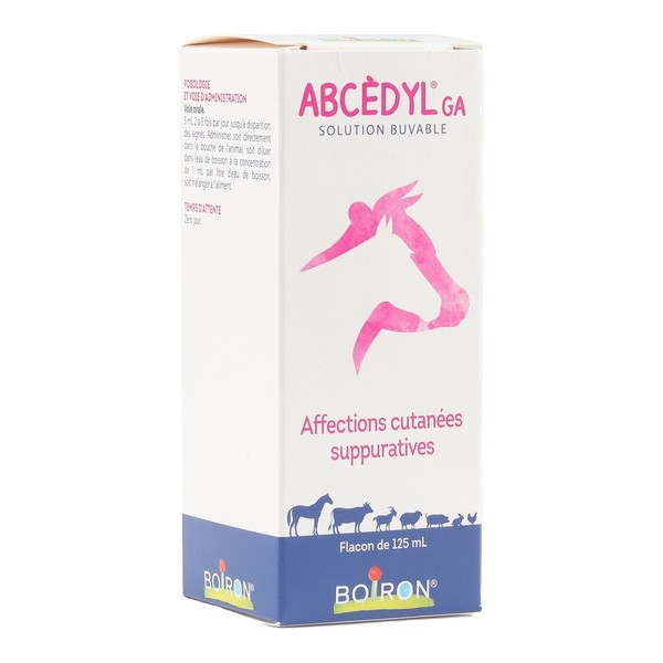 La solution buvable Abcédyl GA du laboratoire Boiron est un médicament homéopathique destiné aux animaux d'élevage que sont les ovins, les bovins, les volailles, les caprins, les porcins et les lapins.