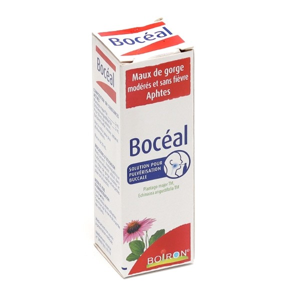 Le Spray Bocéal Maux de gorge et aphtes de Boiron est un médicament homéopathique traditionnellement utilisé dans les cas de maux de gorge modérés et sans fièvre, les aphtes et les petites plaies de la bouche. Il se présente sous forme de solution dans un flacon pour pulvérisation buccale. Ce médicament homéopathique Boiron est réservé à l'adulte et à l'enfant de plus de 6 ans.
