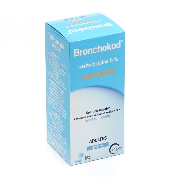 Conditionnement : un flacon de 250 ml.Le sirop Bronchokod contient de la carbocistéine qui est une substance active appartenant à la famille des mucomodificateurs : elle est mucolytique. Elle va rompre les liaisons (pont disulfure) entre les protéines du mucus présent dans les voies respiratoires le rendant ainsi plus liquide et rendant donc plus facile l'évacuation des mucosités grâce à la toux.