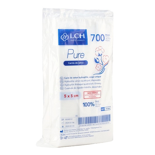 LCH propose un large choix de matériel médical, et sa gamme Pure propose, outre ces carrés de coton, des compresses non tissées, par exemple les compresses stériles LCH Pure.