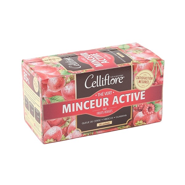Celliflore Thé vert Minceur active est un thé gourmand au savoureux goût de fruits rouges qui permet de bénéficier des propriétés de plantes soigneusement sélectionnées. Il est conditionné sous forme de sachets filtres.