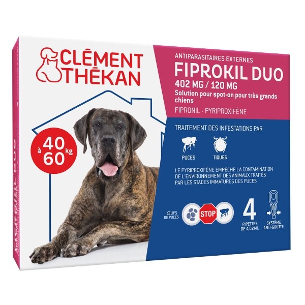 • Fiprokil Duo 402 mg/120 mg pour très grand chien : de 40 à 60 kg (4 pipettes de 4,02 ml)