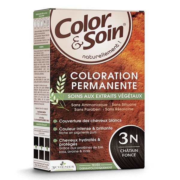 Composée avec des extraits végétaux riches en pigments purs, la coloration permanente châtain foncé 3N Les 3 Chênes Color et Soin permet de colorer les cheveux blancs dès la première application et d’obtenir des résultats aussi performants qu’avec un produit classique.