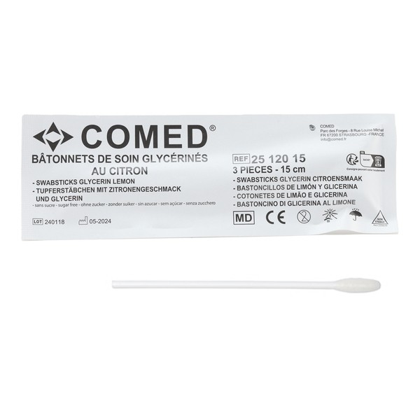 Les bâtonnets de soin glycérinés Comed au citron sont des dispositifs médicaux qui permettent d'assurer l'hygiène buccale des personnes alitées, handicapées ou à mobilité réduite.