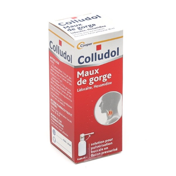 Colludol et Hexaspray sont des collutoires pour la gorge destinés au maux de gorge peu intenses et sans fièvre. Colludol contient un antiseptique local, l'hexamidine, et un anesthésique local, le chlorhydrate de lidocaïne. Hexaspray contient un antibactérien, le biclotymol. Colldudol peut être utilisé à partir de 6 ans alors que Hexaspray peut être utilisé à partir de 30 mois. Ces deux collutoires sont à utiliser à la même posologie à savoir 2 pulvérisations trois fois par jour pendant 5 jours maximum.