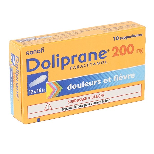 Administré par voie rectale, Doliprane 200 mg suppositoires garantit une absorption complète du paracétamol. La posologie est de 1 suppositoire, à renouveler toutes les 6 heures si nécessaire, sans dépasser 4 suppositoires par jour. La durée maximale du traitement est de 3 jours pour la fièvre, et 5 jours pour les douleurs. Du fait d’un risque d’irritation rectale, l’utilisation de Doliprane 200 mg suppositoires est réservée à une courte durée et doit être remplacée par un traitement par voie orale dès que cela est possible. Ce médicament ne doit pas être administré à l’enfant s’il souffre de diarrhée ou s’il présente une inflammation anale ou rectale récente. Afin d’éviter un surdosage toxique pour le foie, il ne faut pas associer Doliprane 200 mg suppositoires à un autre médicament contenant du paracétamol. En cas de persistance ou d’aggravation des symptômes, une consultation médicale est indispensable.