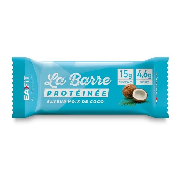 Eafit barre protéinée noix de coco est un en-cas contenant 15 g de protéines et 4,6 g de sucres. Elle complète l'alimentation du sportif en apportant des protéines. Ce sont des nutriments contribuant au maintien et à l'augmentation de la masse musculaire. Les protéines sont également des alliées minceur : elles ont un effet rassasiant, permettant d'atteindre la sensation de satiété. Elles augmentent le métabolisme basal, ce qui va accroitre la dépense énergétique au quotidien.