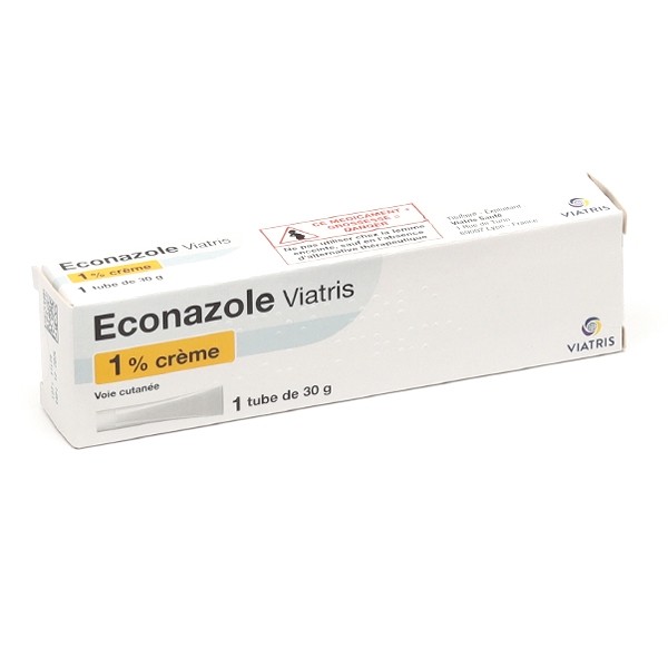 la crème Econazole Viatris: une crème antifongique, à appliquer en massage sur les lésions une fois par jour après lavage et séchage des pieds et surtout entre les orteils.