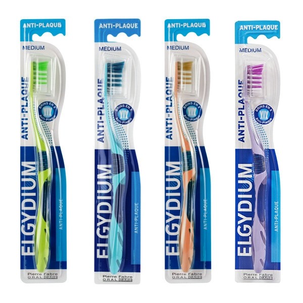 La brosse à dents medium anti-plaque de la marque Elgydium permet un brossage efficace contre la plaque dentaire.