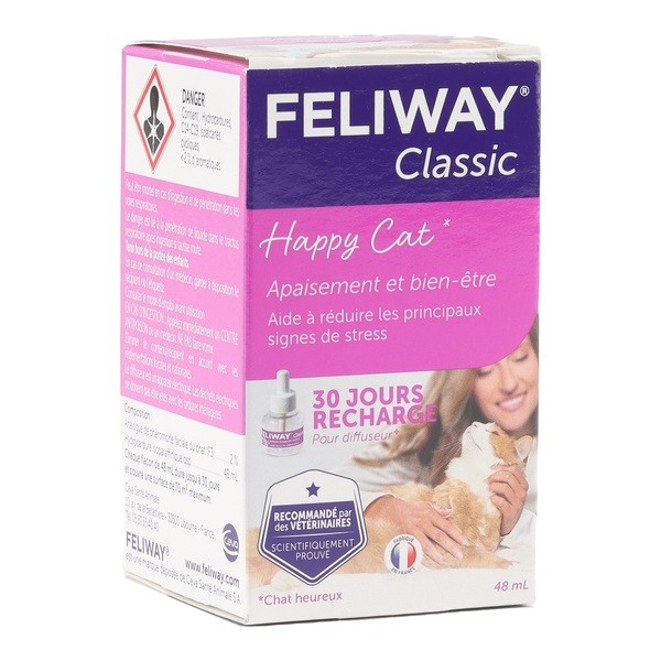D'une contenance de 48 ml, cette recharge correspond à une diffusion totale de 30 jours pour une pièce pouvant atteindre 70 m². Elle ne fonctionne qu'avec le diffuseur de la gamme, le Feliway Classic et convient aussi bien aux chats adultes qu'aux chatons. Il est recommandé de brancher le diffuseur directement sur une prise électrique.
