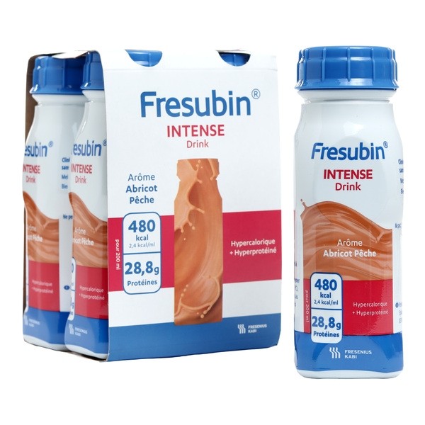 Fresubin Intense Drink Abricot Pêche est une boisson hypercalorique et hyperprotéinée. Présentée dans de petites bouteilles de 200 ml, pratiques et prêtes à l'emploi, cette boisson hypercalorique et hyperprotéinée renferme notamment des protéines, des minéraux (calcium, potassium, magnésium, sodium, chlorure, phosphore, fer, zinc, cuivre, manganèse, fluorure, sélénium et iode) et des vitamines (A, B1, B2, B3, B5, B6, B8, B9, B12, C, D, E et K). Une seule bouteille de Fresubin Intense Drink arôme Abricot Pêche apporte 28,8 g de protéines, 700 mg de calcium, 10 µg de vitamine D et 480 kcal. Le bon goût d'abricot et de pêche de cette boisson hyperprotéinée permet de retrouver la saveur des fruits et constitue une précieuse source de plaisir au quotidien. Fresubin Intense Drink Abricot Pêche est sans gluten et cliniquement sans lactose, pour une tolérance optimale.
