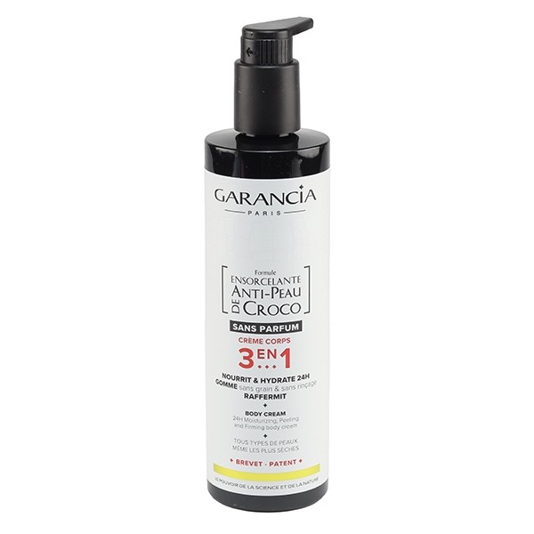 Garancia Formule Ensorcelante Anti peau de croco sans parfum est une crème corps 3 en 1 qui nourrit la peau, gomme et raffermit. Elle procure 24 h d'hydratation. Elle convient pour tous les types de peaux, même les plus sèches. Le résultat, c'est une peau douce, lisse, nourrie et hydratée. La peau bénéficiera d'une seconde peau gainante et non grasse et les cellules mortes qui la recouvrent seront éliminées.