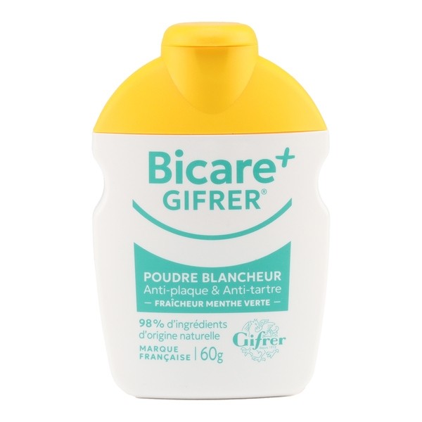 La poudre blancheur Gifrer Bicare Plus est une poudre conçue pour compléter l'hygiène bucco-dentaire quotidienne. Elle apporte une action ciblée contre les colorations dentaires dues notamment à l'alimentation ou encore au tabac. En effet, certains aliments comme la sauce tomate, les betteraves, les myrtilles, le curry et certaines boissons riches en tanins comme le vin, le café ou le thé peuvent colorer les dents durablement. La consommation de tabac peut, elle aussi, entrainer une coloration des dents, des taches dentaires, voire un jaunissement. Enfin, la plaque dentaire liée aux résidus alimentaires et aux bactéries finit par se transformer en tartre à l'origine des caries dentaires et d'une coloration des dents. Pour parfaire votre brossage des dents et vous aider à retrouver des dents plus blanches, Gifrer a créé la poudre blancheur Gifrer Bicare Plus.