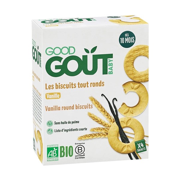 Les biscuits Tout Ronds à la vanille de la marque Good Goût est destiné aux bébés dès 10 mois qui ont déjà des dents, se tiennent assis tout seul et sont habitués à manger du pain et des plats avec des petits morceaux.