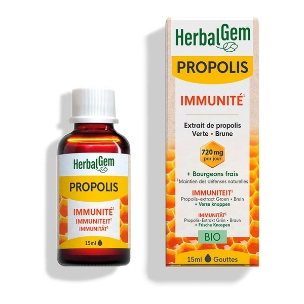 Herbalgem propolis bio en gouttes est un complément alimentaire associant propolis, bourgeons frais et huiles essentielles. Il se présente sous la forme d’un flacon de 15 ml. Herbalgem est un laboratoire spécialisé en gemmothérapie depuis plus de trois décennies. Il utilise des bourgeons frais et issus de l’agriculture biologique. La gemmothérapie repose sur l’utilisation des tissus embryonnaires des végétaux.