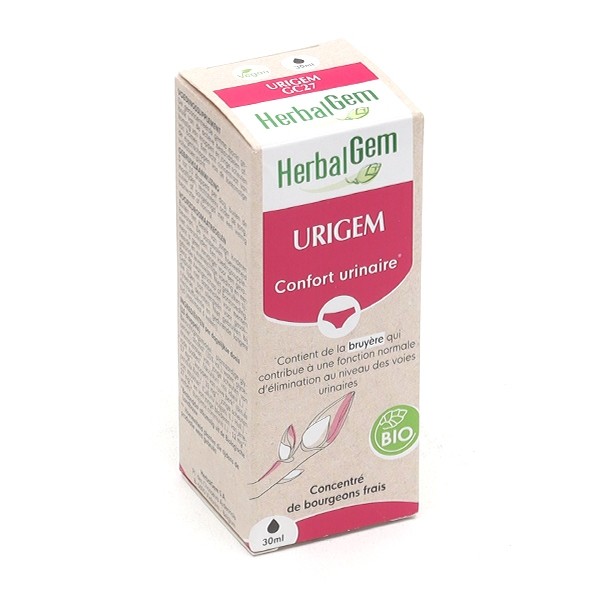 Les laboratoires Herbalgem ont mis au point le complexe de gemmothérapie Urigem qui aide au confort urinaire. Il regroupe 4 extraits de bourgeons : l’airelle, la bruyère, le genévrier et le bouleau. Chaque plante est issue de l’agriculture biologique pour garantir une qualité irréprochable. Herbalgem dispose d’une méthode de macération unique qui consiste à plonger pendant 21 jours, les bourgeons, dans un mélange d’eau, d’alcool et de glycérine pour recueillir un maximum de principes actifs. Les bourgeons sont stabilisés sur le lieu de récolte sans congélation ni broyage préalable.