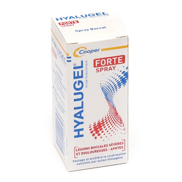 Le spray buccal Hyalugel Forte du laboratoire Cooper est un dispositif médical indiqué en cas d'aphtes importants et de lésions sévères et douloureuses, liées notamment à une intervention chirurgicale de la sphère bucco-dentaire. Il contient de l'acide hyaluronique, son actif principal, dosé à 0,04% et se vaporise directement sur la zone lésée afin de favoriser la cicatrisation et soulager l'inconfort associé à des douleurs. Il ne présente pas de contre-indications ni d'effets indésirables. Hyalugel Forte peut être utilisé chez la femme enceinte, les enfants ou les personnes âgées.