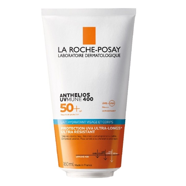 Le lait hydratant solaire Anthelios UVMune 400 SPF 50+ du laboratoire La Roche Posay procure une protection optimale contre les méfaits du soleil en cas d'exposition prolongée. Il agit comme une barrière contre les rayons UV, même les plus pénétrants, et hydrate la peau en profondeur pour préserver sa fraicheur. Il est particulièrement indiqué chez les peaux sensibles ou à tendance atopique et s'applique à la fois sur le visage et le corps.