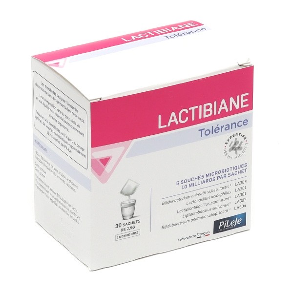 Lactibiane Tolérance de Pileje est un complément alimentaire à base de 5 souches microbiotiques dosées à 10 milliards par sachet :