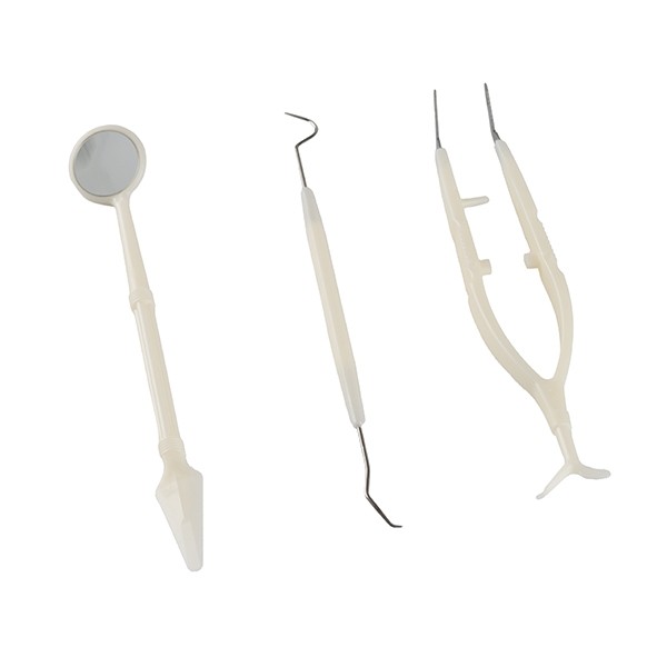 Le miroir dentaire, en premier lieu, offre une bonne visibilité dans l’ensemble de la bouche. Son manche fin et léger permet, en effet, d’accéder aux zones difficiles comme les surfaces internes des dents et de la gencive. A l’autre extrémité du manche se trouve une spatule plate en plastique qui sert à écarter les coins de la bouche et à abaisser la langue durant l’intervention.