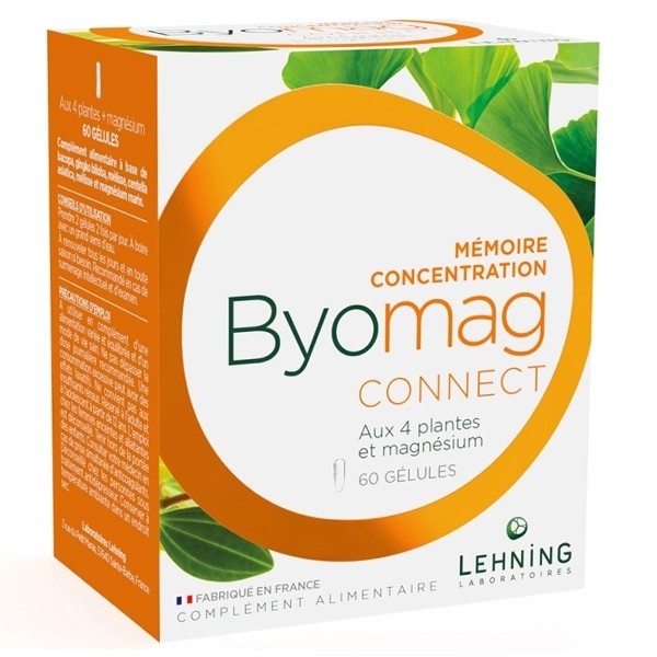 Byomag Connect est un complément alimentaire à base de Bacopa monnieri, Ginkgo biloba, Centella asiatica, Melissa officinalis et Magnésium marin.