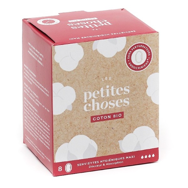 Sachant qu'une femme va être au contact de protections féminines pendant 2400 jours au cours de son existence, Les Petites Choses a tenu à ce que ses serviettes hygiéniques soient le plus douces et le moins agressives possibles. Leur voile intérieur, directement au contact de l'intimité, est en coton provenant intégralement de l'agriculture biologique, de même que le cœur absorbant. Les fibres qui constituent ce coton n'ont pas été blanchies avec du chlore.
