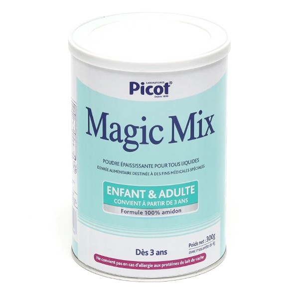La poudre épaississante Magic Mix Picot pour enfants de plus de 3 ans et adultes est utilisée à des fins médicales spécifiques. Cette denrée alimentaire diététique est destinée aux patients atteints de troubles de la déglutition ou ayant des problèmes de passage du bol alimentaire, induisant un risque de fausse route au moment d'avaler.