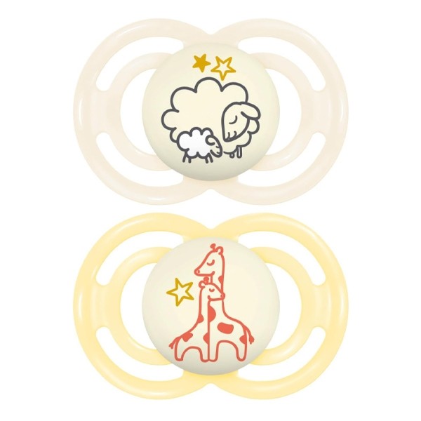 MAM sucette anatomique silicone +6 mois Perfect Nuit a deux particularités : elle brille dans le noir et elle est étudiée pour diminuer le risque de mauvais alignement des dents. Elle a été développée avec des dentistes pédiatriques et des orthodontistes.