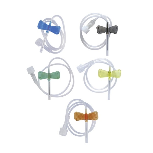 Chacune d’elles est prolongée par une tubulure en PVC de 30 cm qui se connecte au dispositif de perfusion, grâce à un système de verrouillage étanche dit « Luer-Lock ». Par ailleurs, deux ailettes, placées à la base de l’aiguille, permettent de la maintenir fermement sans la saisir directement. La couleur des ailettes indique la gauge de l’aiguille.