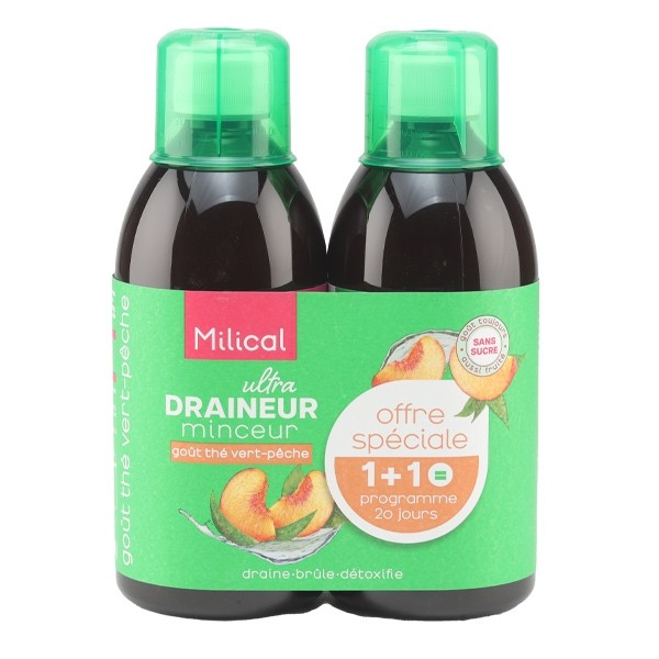 Milical Draineur Ultra Thé vert pêche est une boisson à reconstituer à base de plantes avec édulcorants et au goût thé vert pêche. Il s'agit d'un produit nutritionnel qui vise à vous aider dans votre projet d'amincissement par ses qualités à la fois drainantes, brûle graisses et détoxifiantes, tout en conservant un arôme agréable et fruité, sans sucre.