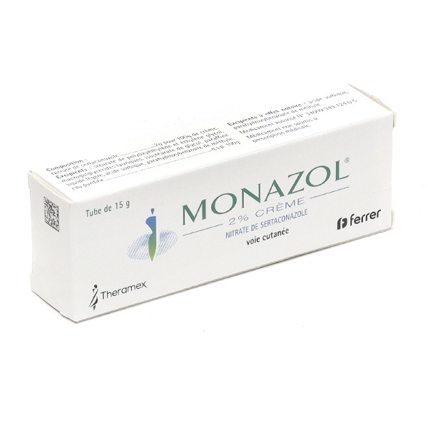Monazol en crème est un médicament antimycosique à appliquer localement. Il est composé de sertaconazole, une molécule appartenant à la classe thérapeutique des imidazolés. Son activité antimycosique s’exerce sur les levures du genre candida et sur les champignons dermatophytes. Cette activité antifongique est complétée par un effet antibiotique sur les bactéries Gram + telles que le Streptocoque et le Staphylocoque). Ce large spectre d’activité rend ce médicament particulièrement intéressant. Il est utilisé dans le traitement des mycoses de la peau et des muqueuses, notamment en cas de candidose.