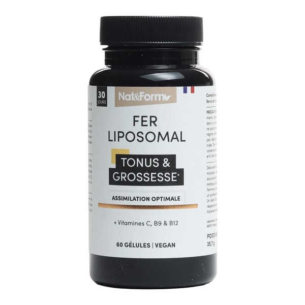 Les gélules Nat et Form Fer liposomal contiennent du Fer liposomal au dosage de 14 mg et des vitamines C, B9 et B12.