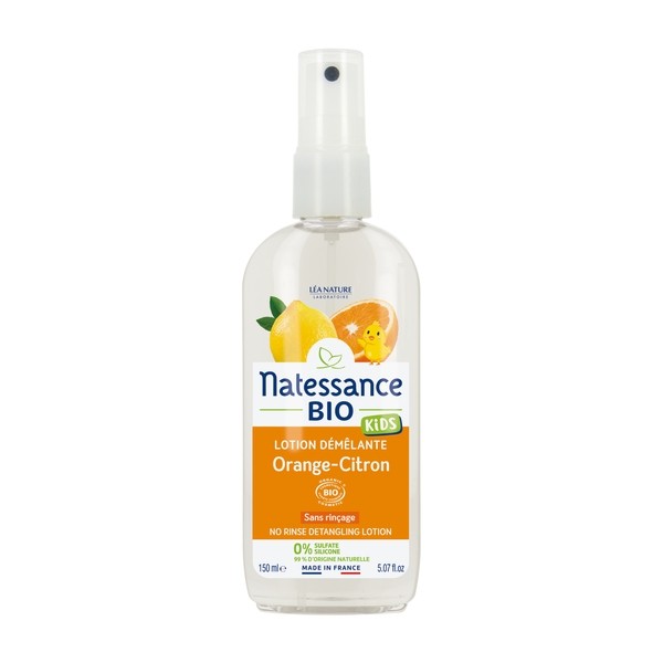 Le démêlant sans rinçage orange-citron Natessance Kids est un soin capillaire certifié bio et conçu spécialement pour les enfants. Utilisé après le shampooing, il facilite grandement l'étape du démêlage des cheveux, en particulier les cheveux longs qui s'emmêlent très facilement. Ce soin peut aussi être appliqué sur cheveux secs, entre deux lavages, pour éliminer les nœuds qui se forment dans la chevelure et, ainsi, faciliter le coiffage.