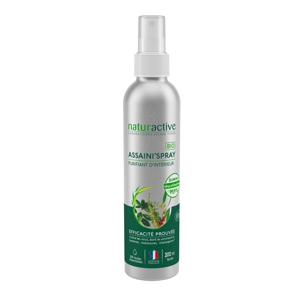 Naturactive Assaini'Spray huiles essentielles bio est un spray qui permet d'assainir l'air ambiant grâce à ses actifs d'origine végétale. Il peut aussi être utilisé sur la literie ainsi que sur la moquette. Il est formulé avec 25 huiles essentielles, toutes d'origine naturelle et intégralement pures. Il est bio. Ce spray est efficace aussi bien sur les virus et les bactéries que sur les levures et les moisissures.