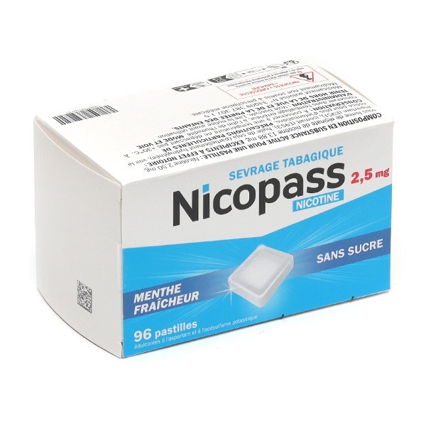 Les pastilles de Nicopass 2.5 mg sont sans sucre et ont un arôme menthe fraîcheur. Ce médicament sans ordonnance est préconisé dans le sevrage tabagique afin de soulager les symptômes de manque chez les personnes qui désire arrêter de fumer.