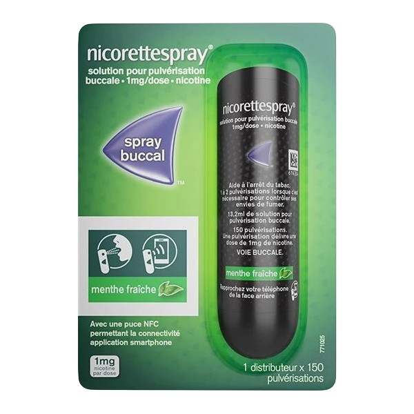 Nicorette Spray 1 mg menthe fraîche est un médicament appartenant à la classe des substituts nicotiniques indiqué dans la prise en charge du sevrage tabagique chez les fumeurs souhaitant arrêter la cigarette. Nicorette Spray est un traitement de type Thérapie de Remplacement de la Nicotine (TRN). Il est équipé d'une puce NFC qui autorise la connexion avec une application pour smartphone qui vous aidera dans le suivi de votre consommation de nicotine (objectifs, conseils, etc.)