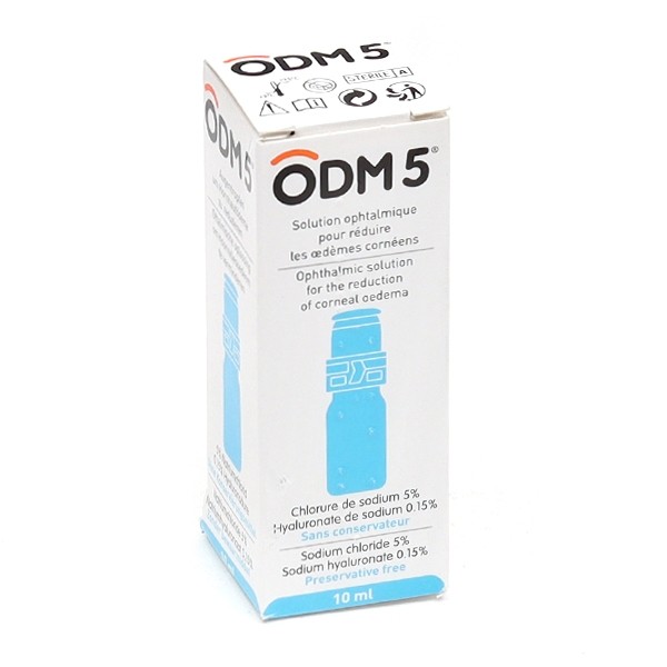ODM 5, des laboratoires Horus Pharma, est un collyre qui va réduire l’œdème cornéen. Contenant du chlorure de sodium, elle agit par hyperosmolarité, en attirant et en retenant les liquides hors de la cornée. Elle est également formulée avec de l'hyaluronate de sodium, qui va aider à la cicatrisation de la cornée et la protéger.