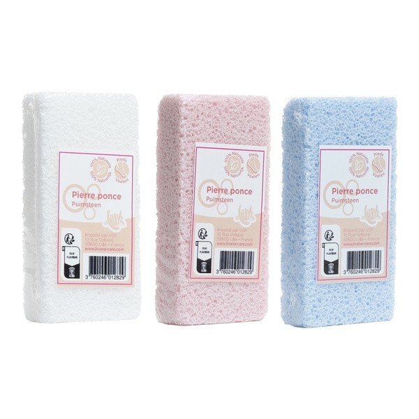 La pierre ponce Livana est 100 % naturelle. Elle est disponible en différentes couleurs : blanc, bleu et rose.