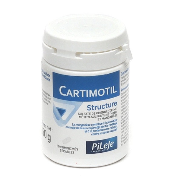 PileJe Cartimotil Structure est un complément alimentaire à base de sulfate de chondroïtine, de méthylsulfonylméthane (MSM) et de manganèse.