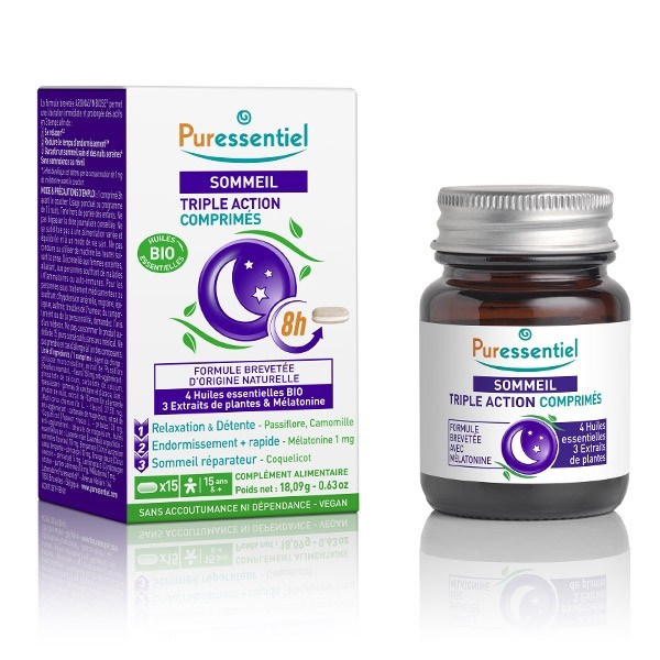 Les comprimés Puressentiel Sommeil Triple action sont un complément alimentaire à base de 4 huiles essentielles bio et 3 extraits de plantes et mélatonine.